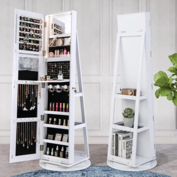 - Automatic LED Lights: Open the cabinet to a beautiful, warm LED light that automatically illuminates your jewelry collection, making every selection a delight.