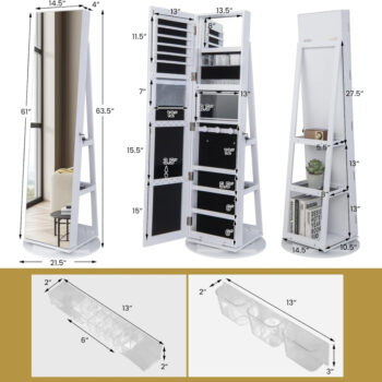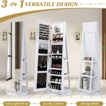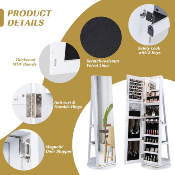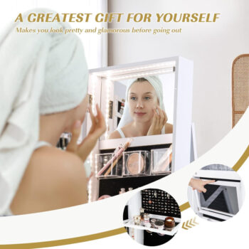 Discover the ultimate solution to your jewelry organization needs with our Full Length Mirror Jewelry Armoire. This innovative 3-in-1 design combines an integrated jewelry armoire, a full-length mirror, and ample storage shelves, offering endless dressing up fun. Crafted with high-density MDF and finished with high-level painting technology, our jewelry cabinet is not only aesthetically pleasing but also moisture-proof, corrosion-resistant, and wear-resistant.